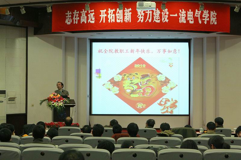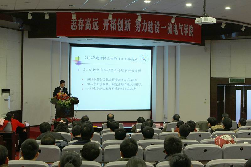 在展望2010年工作时,韦院长提出要以学科建设为龙头,做好十二五规划;要以人为本,继续推进本科教学改革;要抓住机遇,做强做大科学研究,提升学院核心竞争力;要深化教师队伍建设,大力引进高层次和青年骨干人才;要加强校友联系,办好电气学院90华诞。报告最后,韦院长号召全院师生团结起来,开拓创新,为共同创建电气工程一流学科而努力奋斗!