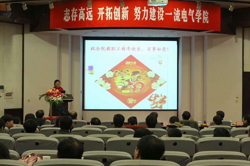 学院主持工作副院长韦巍在会上作了题为“开拓创新,脚踏实地,为率先创建国际一流电气工程学科而努力”的学院工作报告。他对2009年度全院各项事业的发展做了梳理,从科研奖励、科研经费、科研基地建设、教学成果、学生素质和能力、教师队伍结构层次、举办高水平学术论坛、创新型和工程型人才培养、学院文化建设和奖学金等十个方面列出了学院工作十大亮点。展望2010年工作,韦院长提出要以学科建设为龙头,做好十二五规划;要以人为本,继续推进本科教学改革;要抓住机遇,做强做大科学研究,提升学院核心竞争力;要深化教师队伍建设,大力引进高层次和青年骨干人才;要加强校友联系,办好电气学院90华诞。报告最后,韦院长号召全院师生团结起来,开拓创新,为共同创建电气工程一流学科而努力奋斗!
