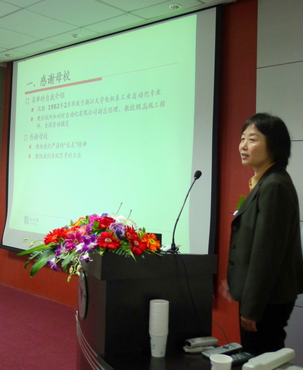 沈勤女士从理性的角度讲述了如何进行职业规划。她用经济学原理阐述了求是与成长的关系:“学自动化专业就要有作配角的心态”、“认识我们所处的时代和全球市场”、“从市场经济学的成本收益角度出发、不断发展”、“从稀缺和效率的角度寻求自我的位置并将自我价值不断放大”、“实事求是的评价自己的风险偏好和抗风险能力”等等,这些前卫的理念给同学们留下了深刻的印象,大家纷纷表示受益匪浅。