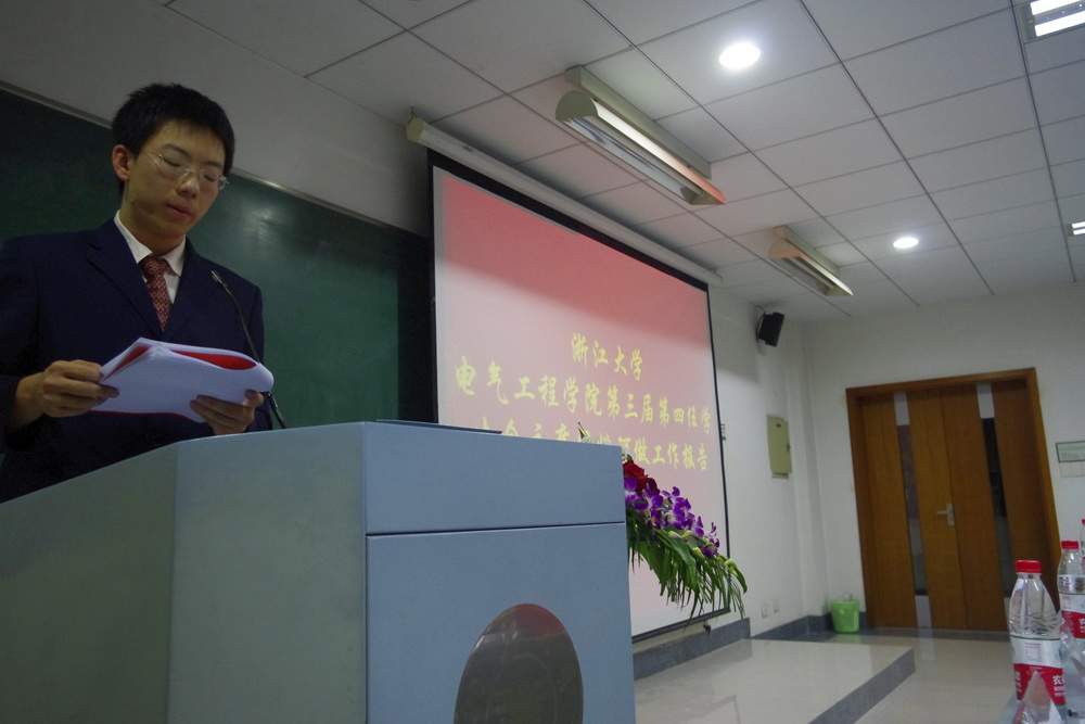 随后,大会进行了mg4355线路检查官网第三届第四任学生会主席团、部长离职与第五任主席团、部长的就职仪式。学院领导向离职同学赠送了纪念品并为新任成员颁发聘书。为更好的传承精品活动,传递以往的工作经验,第四任学生会主席团成员姚珂与第五任学生会主席高一凡分别就过去一年的工作作出报告。报告回顾了过去一年中mg4355线路检查官网学生会所走过的充实而精彩的历程,详细介绍了“电气工程节”、“EE杯”等精品活动的承办经验,并强调了学生会发展校园文化、锻炼学生能力、培养科学素质、配合学院工作的目标。新老主席团还在工作报告中指出过去工作中存在的一些问题并提出了相应的解决建议,希望在今后的活动中能够注意并改正。