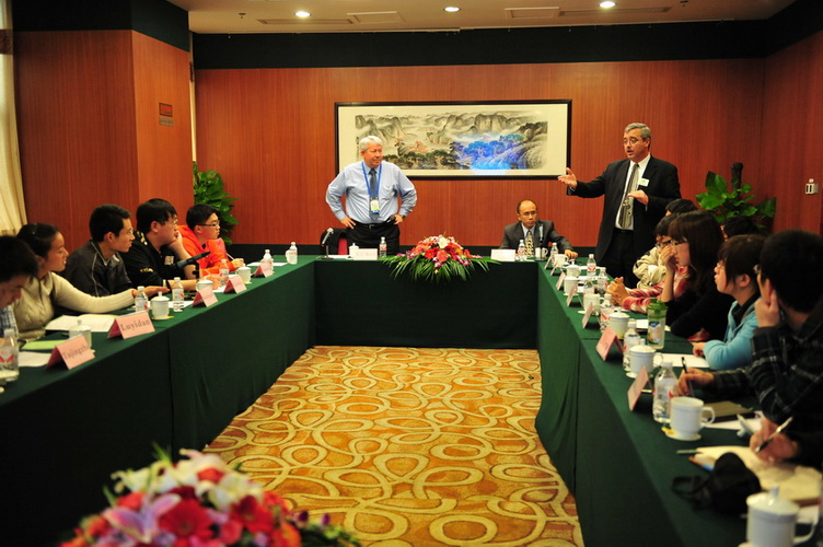 在对IEEE/PES有了更深入的了解之后,同学们对自己关心的问题与主席先生和秘书长先生进行了非常热烈的交流和讨论。本科毕业后准备继续出国深造的石庆鑫首先提出了各国电力状况不一的情况下怎样建立统一的智能电网标准的问题、同样准备出国深造的卢艺丹则比较关心IEEE/PES学生会员申请的要求以及学生会员的益处、博士研究生王冠楠希望PES可以为参加国际会议的学生提供更多费用支持、博士研究生黄宏亮对无法在网上下载早期的重要文献而感到遗憾,希望PES在出版物方面可以提供更加详细的资料以及更加方便的途径、博士研究生屠竞哲就区域间交流/直流联网问题以及电力系统学科与不同学科合作研究智能电网必要性的问题作了提问。针对同学们踊跃的发言和提问,Rotz主席和Ryan秘书长非常耐心地一一给予了应答,他对同学们展现出的热情、活力、对专业的钻研精神感到非常高兴,对同学们寄予了殷切的希望。