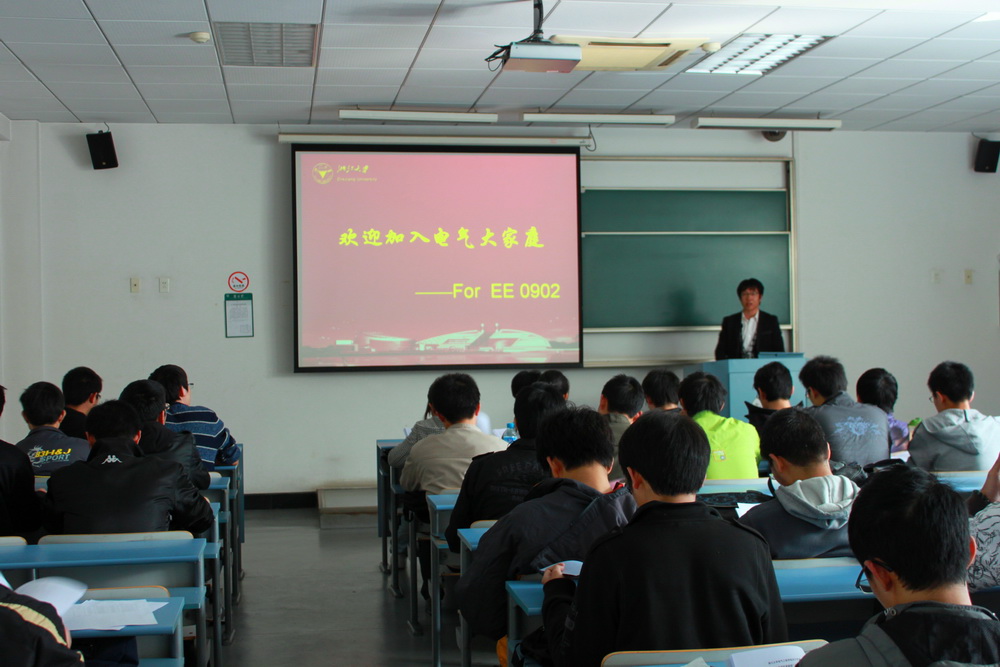见面会正式开始,导学组老师首先欢迎09级同学加入电气大家庭,同时对本班专业作了更详细的介绍,为同学们未来的学习道路指点迷津。初次见面,在学长组简短的自我介绍之后,新同学自我介绍也必不可少。这是一个展示自我的平台,内容丰富,在充分展示自己兴趣特长的同时,也把自己的睿智机敏、幽默风趣展现得淋漓尽致。在自我介绍中,部分同学也表明了自己想为同学们服务的愿望,同学们通过民主投票的方式为自己的新集体选出了“班委”成员。同时,学生会也在每个学科班级中确定学生会联系组,引导同学参与学院有关活动,感受电气氛围,从而有助于加强同学间交流联系,帮助大家建立起对新集体的归属感和荣誉感。