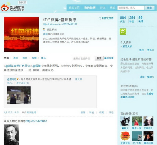 “红色微博”将爱党爱国教育与新兴传播平台相结合,充分利用微博传播快、覆盖面广、互动性强等优势,积极发动基层支部和广大青年学子利用新兴传播平台抒发爱党爱国情怀,赋予纪念建党90周年这一相对严肃主题以鲜活的时代感和生命力。自活动开展至今,大量网友通过电脑或者手机登陆活动页面,踊跃发布消息或图片,发表评论,进行互动。简短的红色寄语,在同学中产生了“蝴蝶效应”,一场“红色接力”已应运而生。截至4月17日,“红色微博”仅仅开通25天,累计发表微博数已达59篇,关注人数接近900人,累计拥有粉丝254人,收到评论及微博留言127条,红色微博博文受到转发63次。
