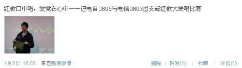 随着活动的开展,在广大网友的热心参与下,红色微博平台承载的资讯和内容不断被丰富,教育意义和宣传价值也不断提高。同学们在微博上转发支部的活动信息,使红色微博成为了支部之间交流和展示风采的舞台: