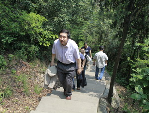 登山途中,一排排绿树夹道相迎,空气中弥漫着树木与青草的香味,还不时会传来几声鸟鸣,给优美的大自然环境带来了悦美的音符。老师们欢歌笑语,互相呐喊加油,互相帮助鼓劲。在那蜿蜓曲折的山道上,有的同志疾步如飞,以测试自己的体能;有的同志漫步而上,以欣赏大自然美丽的景色;更多的同志则是三三两两并肩、交谈而行,以增近彼此的情感。