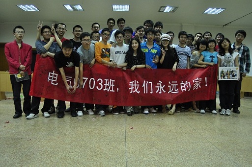2011年5月21日晚,电气0703班在怡电园展开了一场别具一格的趣味班会活动,走进教室,一条巨大的横幅映入眼帘,“我们永远的电气0703班”。Forever and ever。一片温馨的景象,同学们各自带上自己心爱礼物,大家都准备好了送出自己的关心,收获愉悦的心情。