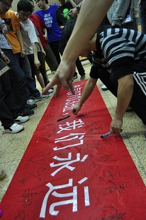 班会接近尾声,班长和几位班委把横幅取下,每个人都在上面留下了各自的名字,更是留下了大学四年的回忆。种种言语,难以表达大家对班级的留恋与感动。一切的一切,归于回忆,更铭刻于大家的心中。