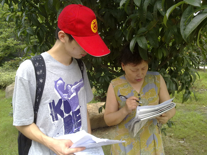 刚刚到达北星社区,本次活动的负责人陈轶同学就开始给大家分配任务。今天,同学们的主要任务就是熟悉北星的环境,为更进一步的工作做准备,同时帮助北星社区党支部发放调查问卷。问卷主要涉及居民朋友对社区服务的满意程度、以及对杭州市城市建设的看法。这次调查是北星社区了解民情、改进工作的一种手段,同时还是杭州市争创全国文明城市活动的一部分。我们都认识到,文明城市创建工作历来受到杭州市各级政府以及基层党组织的重视,能把这样一份重要的调查工作交给浙大的志愿者们,说明了北星社区对浙大学子的完全信任。这份信任令志愿者们感动。