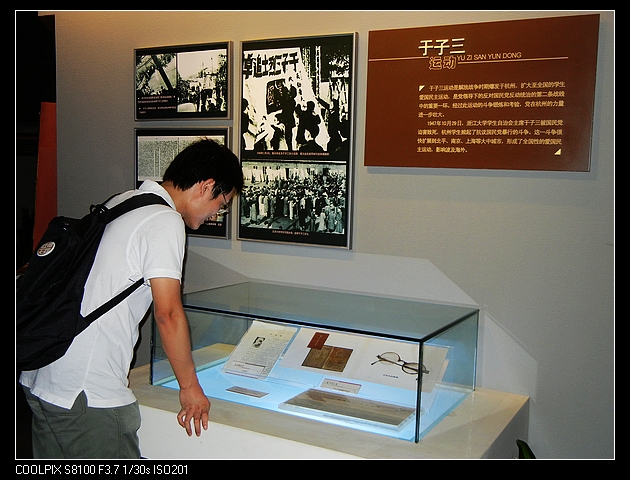 仿佛是为了让人们提前感受到烈士逝去的英魂,我们必须爬过了一段不小的上坡,才看得到肃立在上面的纪念馆。我们首先看到的是广场上矗立的9米高的蔡永祥塑像和写着“为有牺牲多壮烈,敢教日月换新天”的英烈亭,往下看去则是流淌的钱塘江和时而呼啸的火车……走进纪念馆内,林列的展板和栩栩如生的仿真人雕像向我们展示着杭州人民的革命历史。一路走过,跟着历史的主线,我们了解到许许多多不惜牺牲青春、抛洒热血的革命烈士的事迹。有萧山衙前农民运动领导人——李成虎、明知山有虎偏向虎山行的浙江省委书记——张秋人……这让我们感受到革命的艰辛,更感受到了我们现在平静、安宁的校园生活的来之不易。展览厅中的一幅“于子三运动”的展板引起我们的格外注意,1947年10月29日,mg4355线路检查官网农学院学生、学生自治会主席于子三在杭州监狱中遇害,由此引发新一轮以“反迫害、争自由”为主题的学生运动——“于子三运动”。“于子三运动”就发生在我们60多年前mg4355线路检查官网,前后持续四个半月,参加运动的不仅有青年学生,还有全体教师员工,同时得到社会的广泛同情和支持。全体教授罢教、全体讲师助教罢教,这在我们整个浙大校史上都是史无前例的。但作为度过了大半个大学生涯的浙大学生,我竟然不知道这场轰轰烈烈的民主运动。想到为了民主自由甚至献出生命的学生们,为了中国人民的解放事业甘洒一腔热血的英烈们,我确实应该想一想,在舒适的环境中学习、生活的我们,应该如何停止对生活无理的抱怨、如何怀着积极的心态为国家和社会贡献自己的力量。