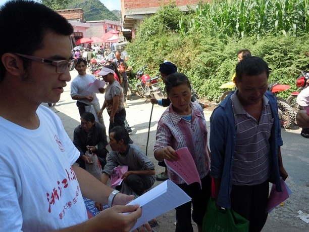在上午的宣传中,许多赶集的老乡对队员们的宣传活动表现出浓厚的兴趣,纷纷驻足浏览宣传海报,向支教队员询问详细内容。队员们就建党九十周年来中国共产党走过的艰辛历程、为中华民族的独立复兴做出的卓绝贡献和取得的辉煌成就向老乡们做了简略的讲解,为他们详尽地介绍了中国共产党的几次历史转折性会议。由于龙里县与遵义会议的召开地相距不远,队员们着重解释了遵义会议对我党生死存亡的重要性和对我党发展壮大的深远意义。针对不少苗族老乡不识字的特殊情况,支教队员们在详细讲解之外还向他们赠送了一份宣传资料,请他们回家之后让家里上学的小孩念给他们听。在队员们做宣传时,不少小学生也被吸引过来,队员们便在党史宣传之外,着重向他们介绍了浙大在抗战中“文军西征”的故事,鼓励他们在艰苦的环境中好好学习,争取以后报考mg4355线路检查官网、报效国家。