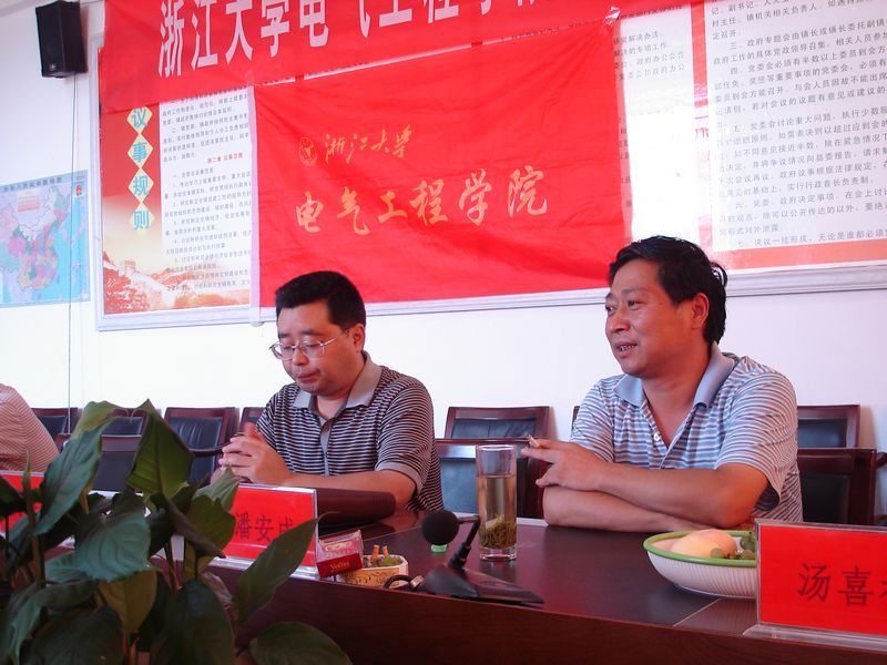 座谈会首先由杨兴镇长致辞。他指出:湄潭与浙大地校情深,尤其是电气学院,已经和湄潭建立起了良好的交流机制。杨镇长还举例说汤文开先生作为老一辈浙大人,对湄潭电力发展做出的奠基性的贡献,浙大从西迁开始就不断为湄潭的发展起到促进作用,因此在未来还要进一步加强地校之间的沟通和交流。接着杨镇长的话题,汤喜福老人回忆了他父亲在浙大和湄潭工作的一些情况,并鼓励我们实践团队的成员有机会多到湄潭来实践走访。随后由我们实践团队的同学分块向与会领导和嘉宾介绍了五年来学院各届挂职团队在湄潭所做的工作,在报告的最后,已经带队两年的朱弘为报告作了小结,他结合自己去年挂职的感受同与会人员交流了自己对于湄潭的看法,并表达了自己对于湄潭即是浙大第二故乡又是自己第二故乡的热爱之情。