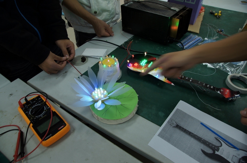 经过一段时间的精心准备,11月19号全天、20号上午,参赛队伍分批来到东三107焊接室,制作他们心中设想的彩灯。制作过程中,参赛的同学充分发挥想象力和动手能力,利用生活中常用的材料,结合E志者协会提供的LED灯和外围电路,制作出一盏盏色彩绚丽的彩灯。另外,在制作过程中,参赛同学表现出了对电路工作原理的极大兴趣,不断有同学向协会技术人员询问相关电路知识。