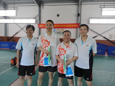 比赛采用抽签随机组合、三场11分制、淘汰赛的方式进行。只见球拍挥舞、白羽翻飞,欢声笑语在运动馆内回荡。经过两个多小时的奋力拼杀,甘德强、潘再平组合拔得头筹,陈昭、孙志锋组合屈居第二,赵荣祥、沈辉组合获得第三。