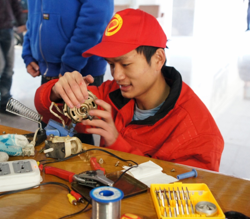 下午,更多老人带来了损坏电器,技术骨干们再次进入紧张的维修工作中,其他同学陪老人们聊聊天,解解闷。不久,电饭煲里的水又烧开了,收音机再次传出悦耳的歌声,电风扇也灵活地转动起来,爷爷奶奶们露出开心的笑容,对E志者们的维修技能和服务态度赞不绝口。