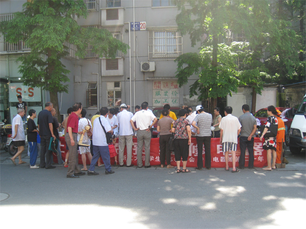 烈日炎炎,E志者们的热情胜似骄阳。在社区服务工作站负责人的协调与安排下,E志者们在社区内的空地上摆开桌子,桌前围起“深入社区免费维修电器”的鲜红横幅,从专业的工具箱里摆出电烙铁、万用表、各种螺丝刀等必备工具,义务维修现场服务点很快搭建完成。看到过前期报纸宣传的居民都纷纷慕名而来,许多路过的居民也带着家里损坏的电风扇、电蚊拍、电热水壶、台灯等各种小电器汇集到维修现场。维修现场的气氛一下子火热起来,E志者们的热情感染了大家。