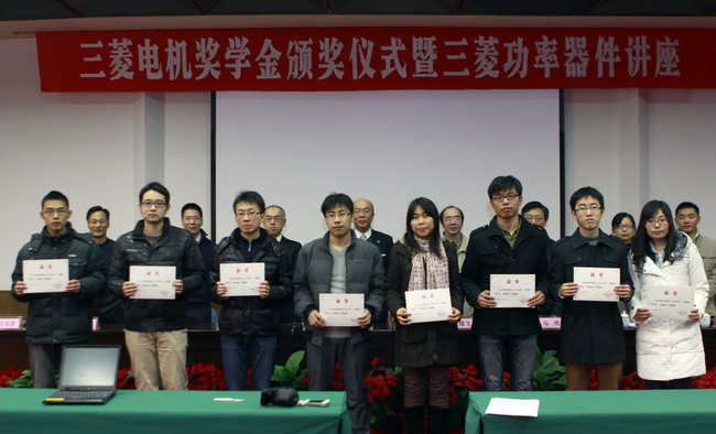 杜丽首先宣读了获得2012届三菱电机奖学金的学生名单,本年度mg4355线路检查官网共有3位博士生和6位硕士生获此殊荣。三菱电机代表团与电气学院领导共同为同学们颁发了三菱电机奖学金证书,并合影留念。