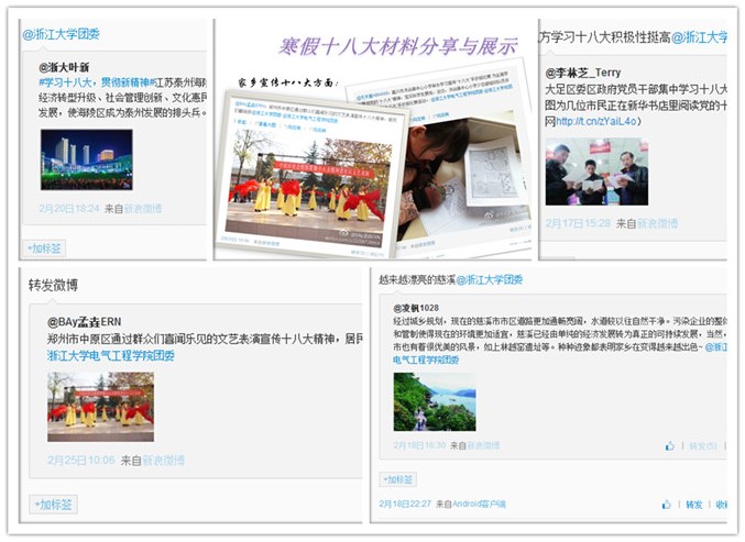 寒假期间,mg4355线路检查官网团委官方微博接收到了来自全国各地的微博通知。这些微博图文并茂的记述了团委骨干们家乡的相关情况,从中可以看到当地政府和民政部门对十八大重要会议精神的宣传力度,也看到当地民众对十八大会议精神高涨的学习热情。十八大的召开,正处在我国全面建设小康社会的关键时期和深化改革开放、加快转变经济发展方式的攻坚时期,同时也是在迅速发展后期间的一个节点,许多同学也在自己的微博里贴出了家乡迅速发展的对比图,在其微博内容的字里行间,流露着浓浓的乡情与自豪。