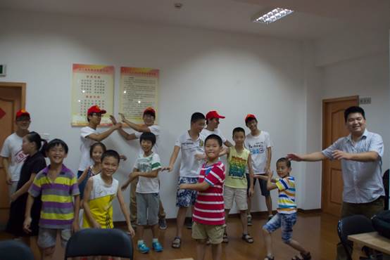 我们在社会实践的第一天便为社区的孩子们组织了丰富多彩的活动。在社区负责人的有效组织下,小朋友们有序进入活动室。根据之前的安排及小区负责人的要求,开展我们的志愿者活动。首先是跟小朋友的互动与熟悉,与小朋友一起做健身体操。小朋友们认真的态度让我们这些大学生忘我的加入了他们。健身操结束以后,志愿者们先一一向小朋友们以及在场的工作人员介绍自己,然后按照座位顺序让小朋友们一一介绍自己,小朋友们都很积极配合的介绍自己的姓名,年纪以及兴趣爱好,通过这一环节,不仅让小朋友们对我们有映像,更加深我们对他们的了解,方便接下来活动的进行。