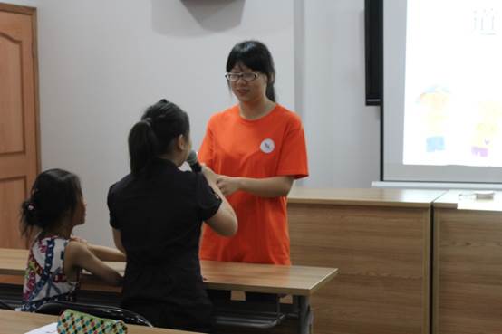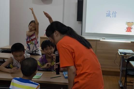 破冰活动结束以后是事先预定的道德讲堂课。道德讲堂课分为两节,分别讲述不同的预选的内容,课间留有10分钟让小朋友们休息放松与志愿者互动。课上主持人结合PPT,短片动漫,成语故事,弟子规以及发生在小朋友们身边的一些小事,通过提问以及引导的形式让他们自己去分辨什么是应该做的,什么是应该改正的,什么是该提倡的以及为什么。对于回答的很好的小朋友给予小小的奖励以鼓励他们克服胆怯积极发言。我们希望通过这个课向小朋友们传达一些基本的但是重要的道德修养,可以给他们一些道德的萌芽,可以让他们认识到道德的重要以及道德的重要性。课上小朋友们争先恐后发表自己的观点并且所说的都是带有自己独特想法。他们的积极也鼓舞了我们,让我们更加干劲十足。