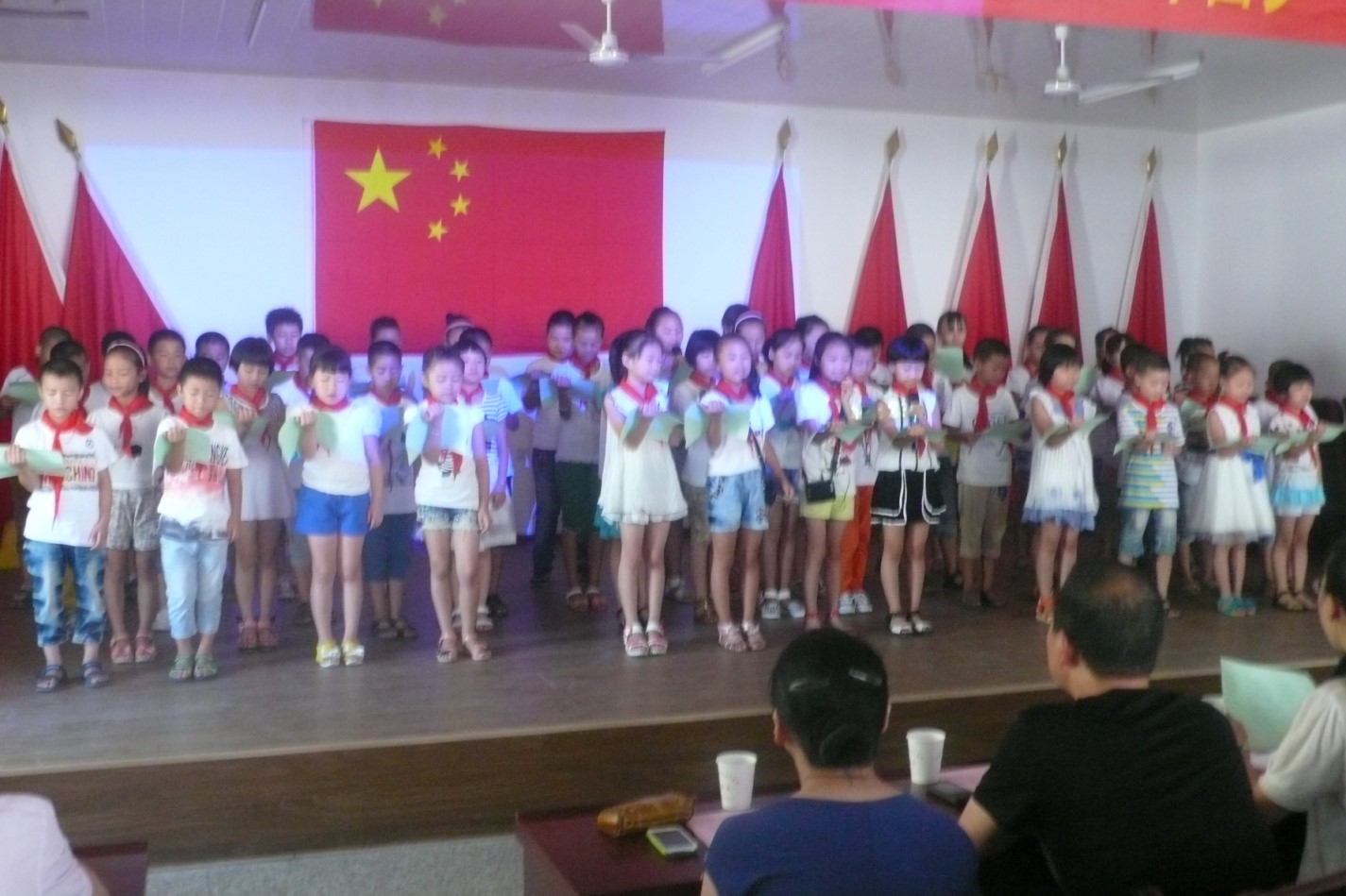 随后,四位实践团成员带来了合唱《梦想天空分外蓝》,表达实践团队对各位老师和同学大力支持配合的感激之情,同时向大家展示课堂之外的青春活力另一面,台下的观众也向他们报以雷鸣般的掌声,感谢几位老师们的辛勤工作。其后,在朗朗上口的大合唱《红领巾相约中国梦》、《少先队员队歌》中,文艺演出部分宣告结束。