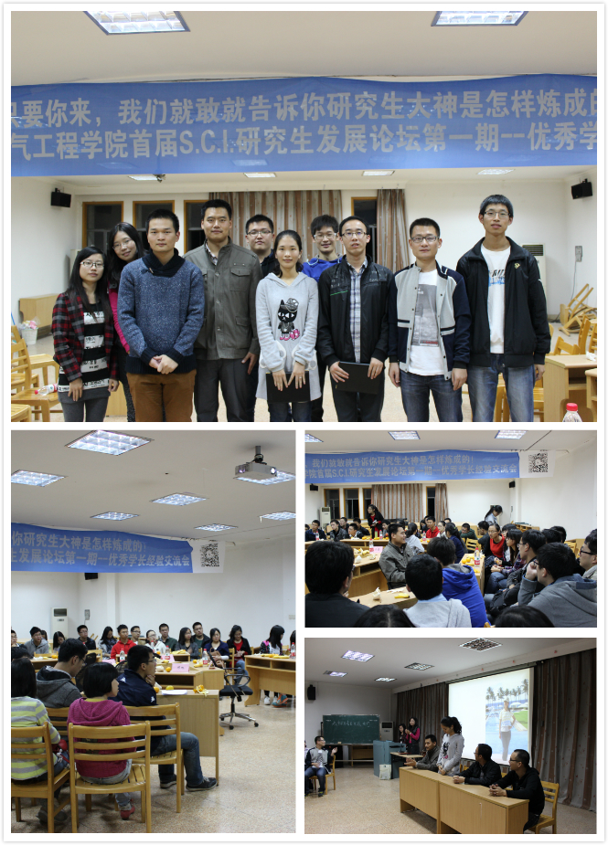 对于研究生一年级的新生们来说,研究生生活已经度过了近两个月的时间。这两个月内,每个人都有着各自的目标和规划,也相应地有各自的困惑与迷茫。针对新生们的需求,mg4355线路检查官网团委、研究生会于2013年10月28日晚6:30分在电机工程楼418举办了第四期S.C.I研究生发展论坛。本次论坛邀请到了电机与电器方向的徐海亮、电力系统方向的邓旭、控制理论与控制工程方向的王莉莉和电力电子与电力传动方向的向鑫四位国奖获得者为大家分享他们研究生生活中的经验与感悟。