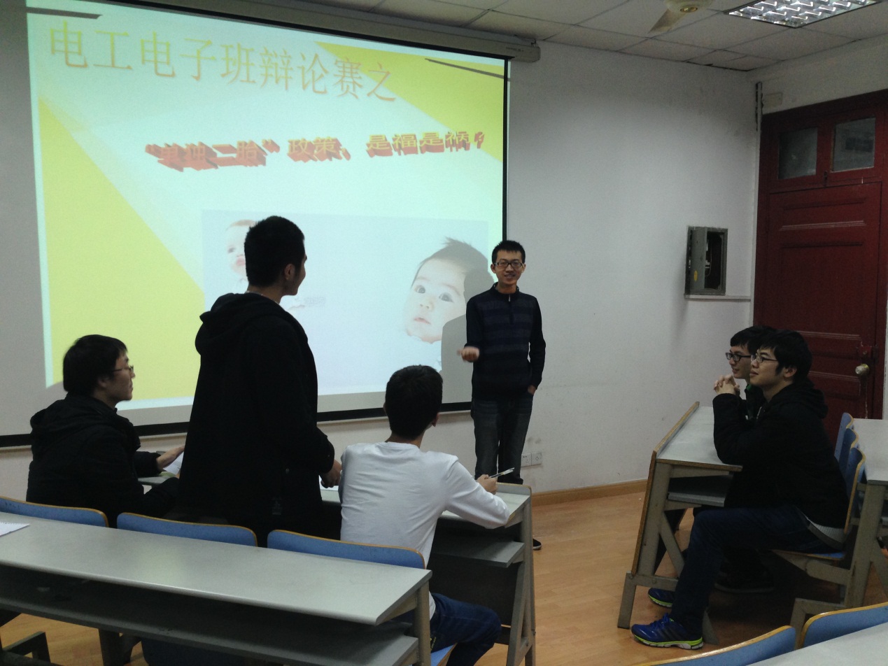 随着党中央十八大三中全会的召开,开放“单独二胎”政策引发了热议。那么“单独二胎”政策到底是福是祸?为此,电工电子班的同学们各执己见。借此契机,党、团支部决定举办一次围绕该话题的辩论赛,既能丰富同学们的业余生活,又能提升大家的辩证思维。