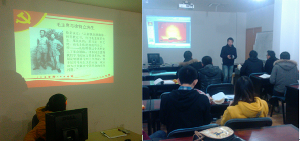 晚上七点,活动如期举行。支部书记赵兴农同志最先概述了毛主席的青年经历,从韶山私塾,到驻省中学,从投笔从戎,到湖南省立师范学校,青年毛主席在每个阶段都在不停地求索和实践,毛主席年轻时的经历既是那个时代无数有为青年奋斗求真的集中体现,又具有不用常人的勤于调查、理论结合实践的特点,《中国社会各阶级的分析》、《湖南农民运动考察报告》等文章,都反映毛主席的过人之处,我们作为当代的青年人,都应该学习这种广泛调查、理性分析的精神。