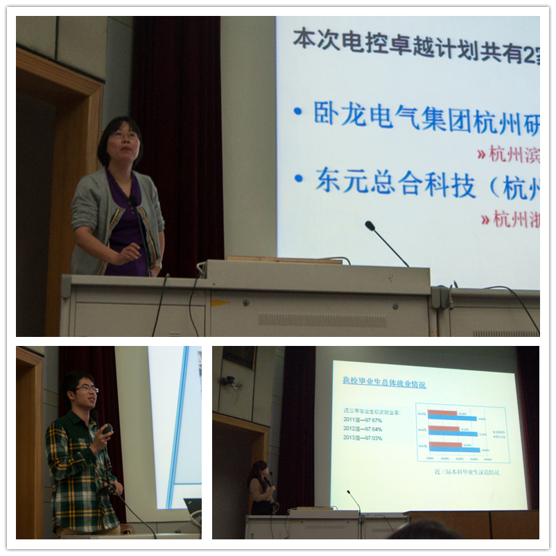 接下来自动化专业教学主任姚维老师对2011级实施“卓越计划”的企业实习单位杭州鸿雁电器、杭州中粮包装、帝麦克斯(苏州)医疗科技、天宏激光股份、浙江求是科教进行了一一介绍。针对电气工程及自动化的电控和电自方向,卢琴芬老师与王慧芳老师分别向与会同学介绍了卧龙电气集团杭州研究院、东元总合科技(杭州)、无锡台安科技、浙江省电力设计院、杭州市电力设计院、国网北京经济技术研究院、TE公司的具体情况。电信专业教学主任王正仕老师则介绍了电信专业内电力电子方向和集成电路方向相关企业如台达能源技术(上海)、飞利浦亚洲研究院(上海)、伊博电源(杭州)、杭州杰华特科技和杭州矽力杰半导体、亚德诺半导体技术(中国)、杭州中天微系统的情况和对于实习学生的要求以及考核办法。