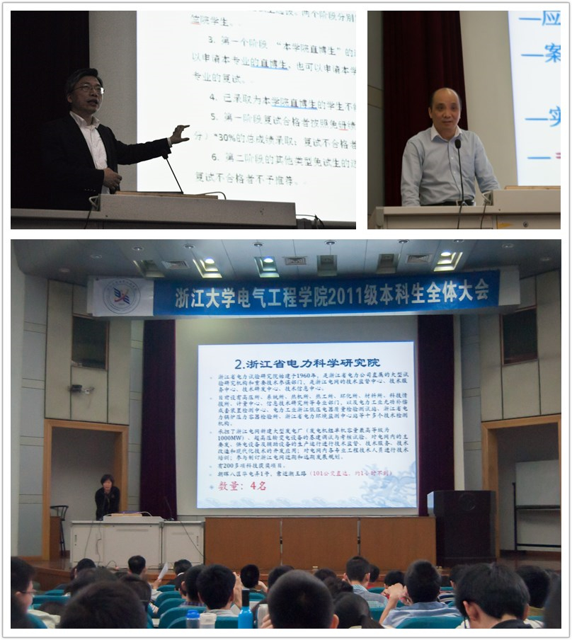 在各位老师的介绍讲解之后,大会还专门安排了2010级电气专业、自动化专业、电信专业参加“卓越计划”试点工作的学长向与会的各位11级同学进行了汇报。首先上台的是林昶咏,他从浙江省电力设计院概况、实习内容、实习环境、毕业设计选题、实习收获、对学弟学妹们的建议等几个方面向大家汇报了2010级电气专业“卓越计划”长时间实习的基本情况。第二位上台汇报的吴煌荧则是结合自己对于实习单位东元总合科技(杭州)有限公司的认识和介绍阐述了自己参与“卓越计划”的收获与感悟。随后自动化专业的成艺学姐向大家介绍了自己在中粮包装的具体实习情况。最后来晨学长、胡瑞学长分别介绍了自己在矽力杰(杭州)和上海台达能源技术有限公司的实习情况。学长学姐们详细的讲解令在场的每一位同学都收获颇丰,也更加形象具体地认识到“卓越计划”的实质内容和相关要求。
