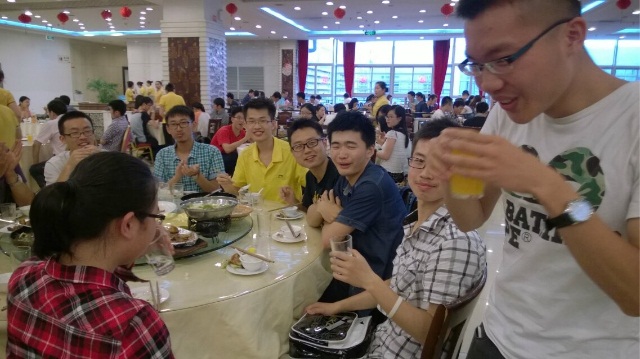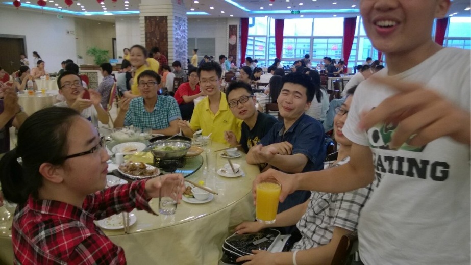 边吃边玩边说边聊,这也许是许多同学在大学里最开心最轻松的时光吧!大家相互抢菜、干杯、讲笑话,早已全然没有刚来之时的腼腆与沉默,你哄我抢之间,尽显同学们之间无瑕的友谊。也许是大家的开心感染了周围的人,原本沉寂的餐厅也变得热闹了起来,连服务员都笑了。