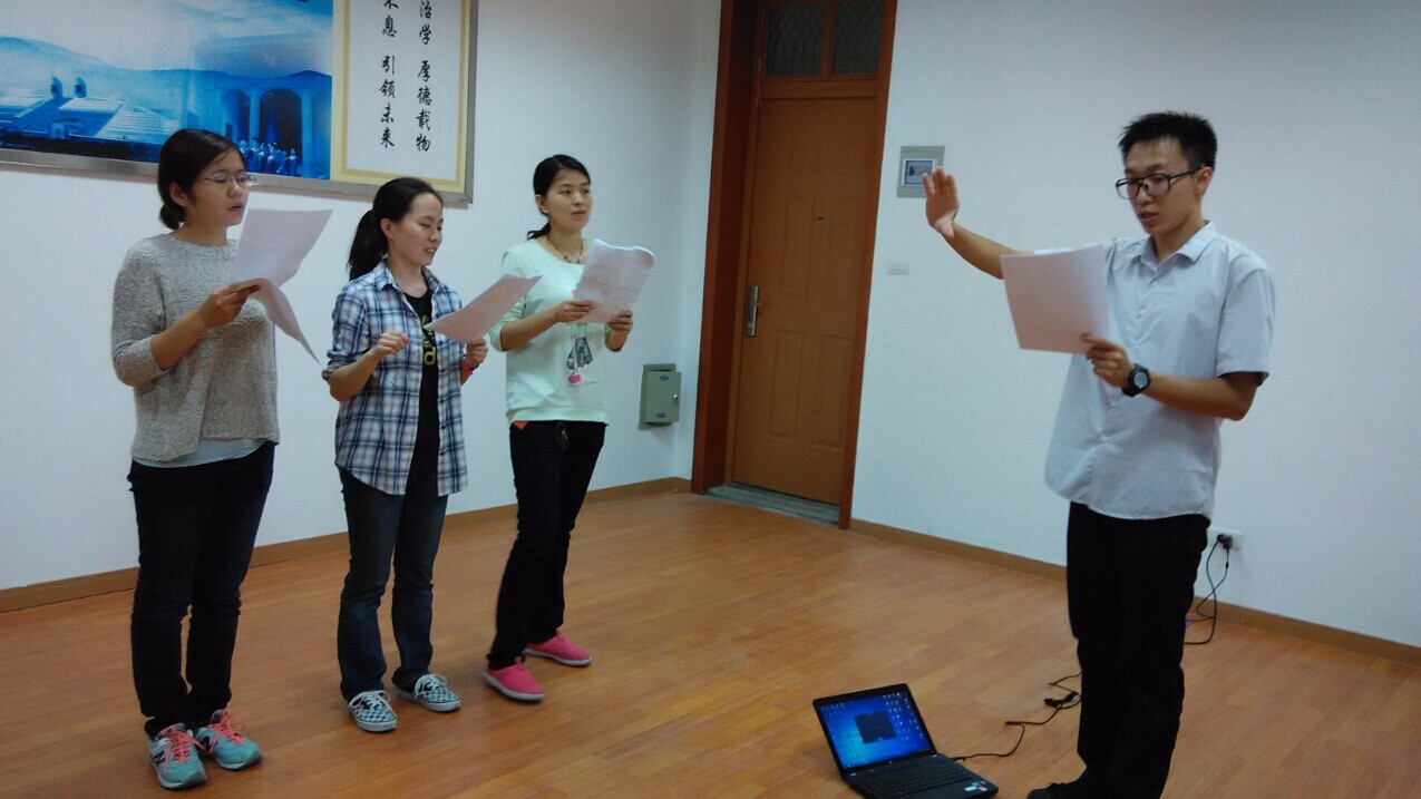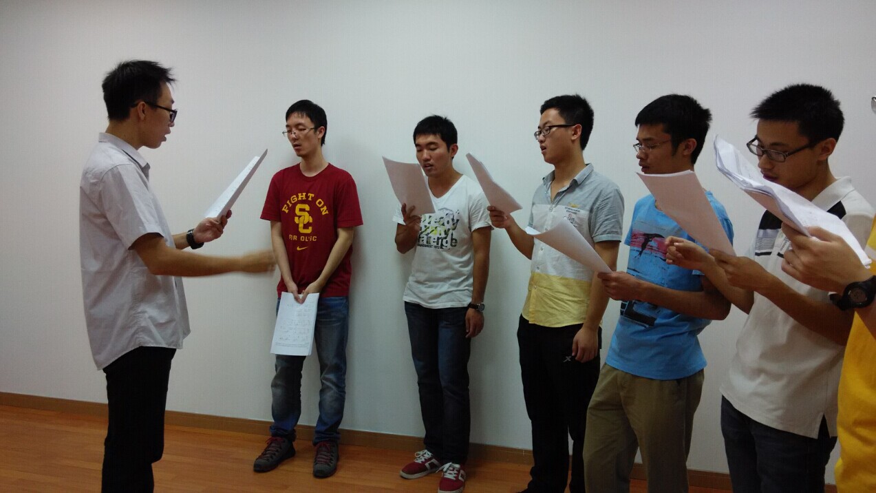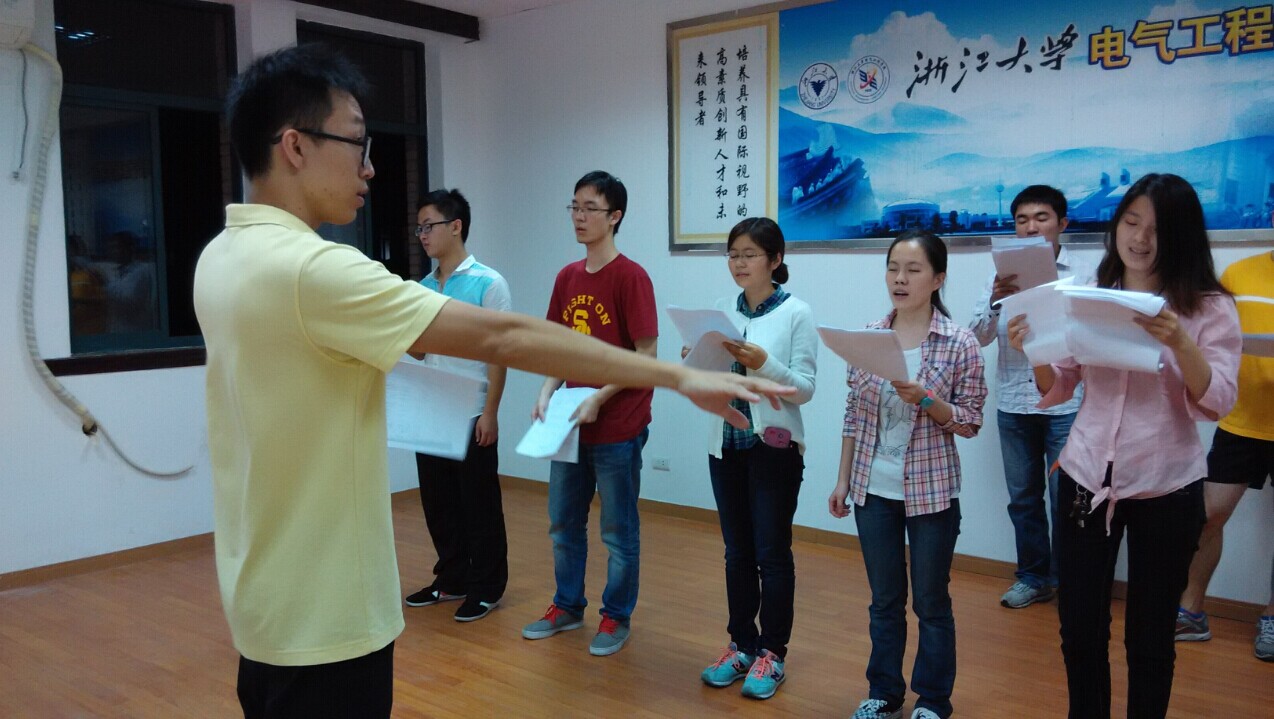 十一小长假回来后,班级同学就开始了热情高涨的合唱训练。10月9号,第一次正式集体排练。由于电工硕士班的新生人数远少于其他班级,班长特此动员了研二的师兄师姐前来助阵,并由文体委员林申力进行专业的指导和编排。“大不自多,海纳江河”,浙大校歌开始在教二422教室里回响。尽管新生基本上都不是本校的,但是大家在国庆假期里都已经熟记了歌词,重复听了好多遍,因此训练伊始,大家基本上都熟悉了旋律,有了一定的基础。林指导根据每位同学的音乐唱功进行了分队编排,唱功较好的编为A队,自行组织练习,然后对基础较差的B队逐个指导改造,耐心地帮助他们矫正音准和音调。每个人都不厌其烦地一遍又一遍练习,积极热情地投入其中。10月10号,第二次排练时,每个人都有了较大的进步。文体委员林申力指挥班级脱稿合唱,并从细节处着眼,逐句逐点地纠正不足,以求合唱声音更准确更圆润更整齐。在林申力不辞辛苦的指导下,合唱效果有了明显的提高。之后,我们开始练习自选曲目《大海啊故乡》,林申力花了大量心思,重新编排了曲目,增加了朗诵、哼唱、女声独唱、乐器演奏等多种表现形式,使得该歌曲更深情质朴、优美动听,更好地传达了该歌曲所表达的对祖国母亲的深挚情感!
