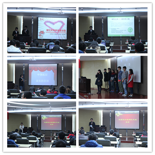 接下来是主题分享环节,四个在公益实践领域受到学生广泛认可的星级社团为大家讲述了他们在志愿服务和公益实践路上的所感所想。爱心社的赵润泽、孙雨乐同学带来了心暖系列慈善活动的相关介绍;绿之源协会会长蒙志全倡导“亲近自然,践行环保“,呼吁广大同学积极参与环保活动;红十字会的同学以声情并茂的表演和手语舞让在场同学对专业医疗服务有了更深刻的认知;第十五届研究生支教团团长胡旭珺讲述了西部支教路上的点点滴滴,展示了中国底层最真实的贫困。