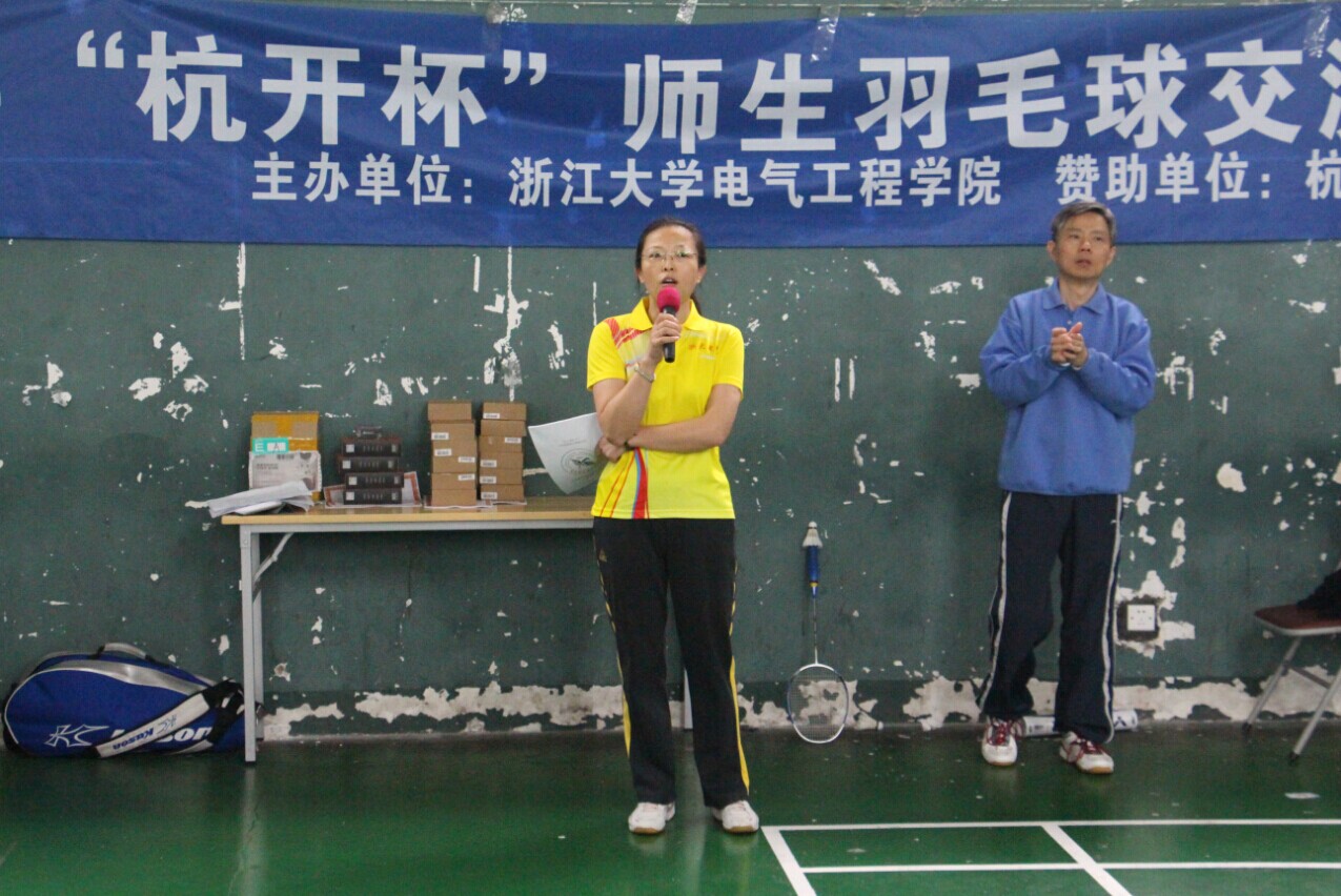 在比赛正式开始之前,学院党委副书记、工会主席王玉芬老师为比赛作了精彩的致辞,并为之前“EE杯”学生羽毛球赛中脱颖而出的前八名队伍颁发了获奖证书和奖品。同时,王老师也对师生羽毛球赛的赞助单位——杭开集团表达了衷心的感谢。