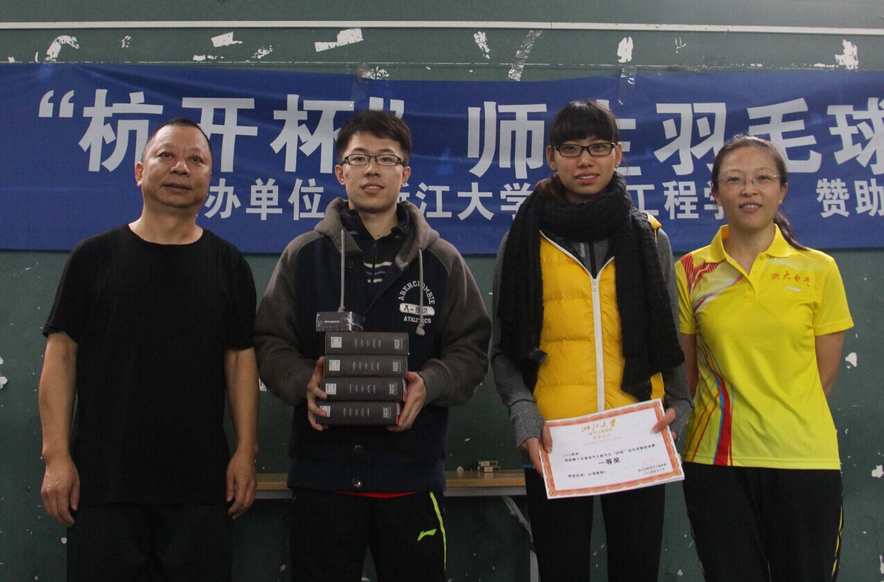 比赛是残酷的,很快今天的战况落定——由辛焕海老师和张晟同学组成的队伍在决赛中战胜干于老师和肖晃庆同学,获得本次“杭开杯”师生羽毛球赛的冠军,全场都为他们送去了热烈的掌声。