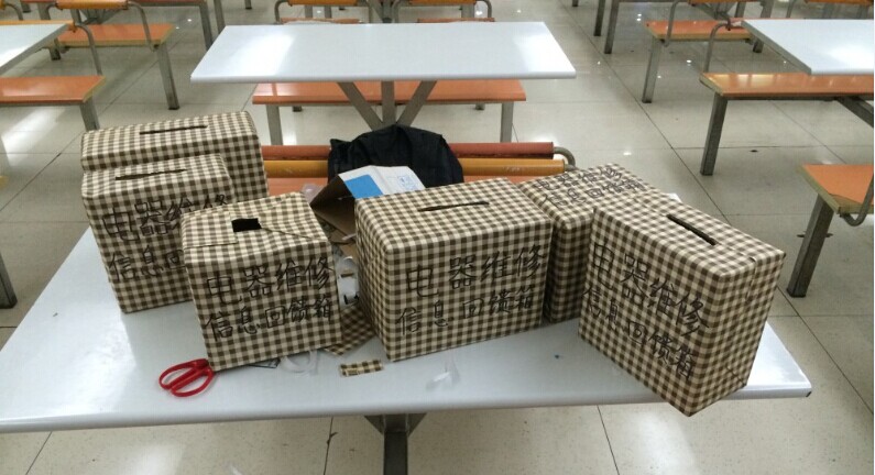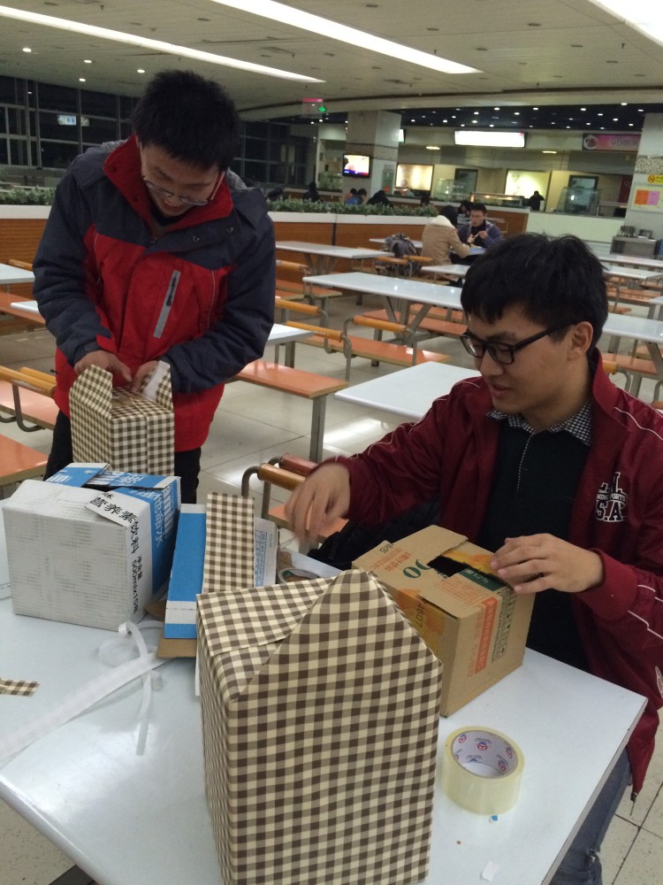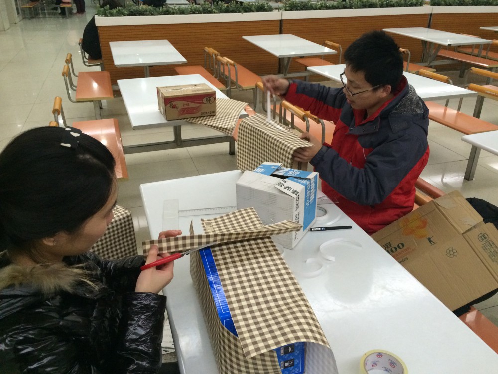 在讨论完小组的讲座计划后,小组成员一同制作了寝室信息收集像,用以记录同学们反馈的问题。剪刀在纸箱间辗转腾挪,一个个笨重的纸箱在顷刻间被做成了精美的纸盒。同学们出色的动手能力很好的完成了这些信息收集箱。