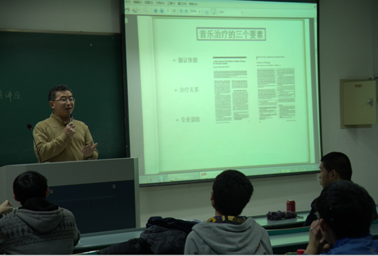 本次主题讲座的主讲人是我校陈树林老师,作为一名将音乐治疗作为研究课题的著名学者,他为我们精心准备了一次精彩的演讲。陈老师从音乐治疗的历史讲起,用深入浅出的语言为我们揭示音乐治疗的作用与音乐治疗对大学生心理健康的帮助,他的语言幽默风趣,富有感染力的同时又有学者的严谨,台下的同学们不时爆发出笑声与鼓掌声。