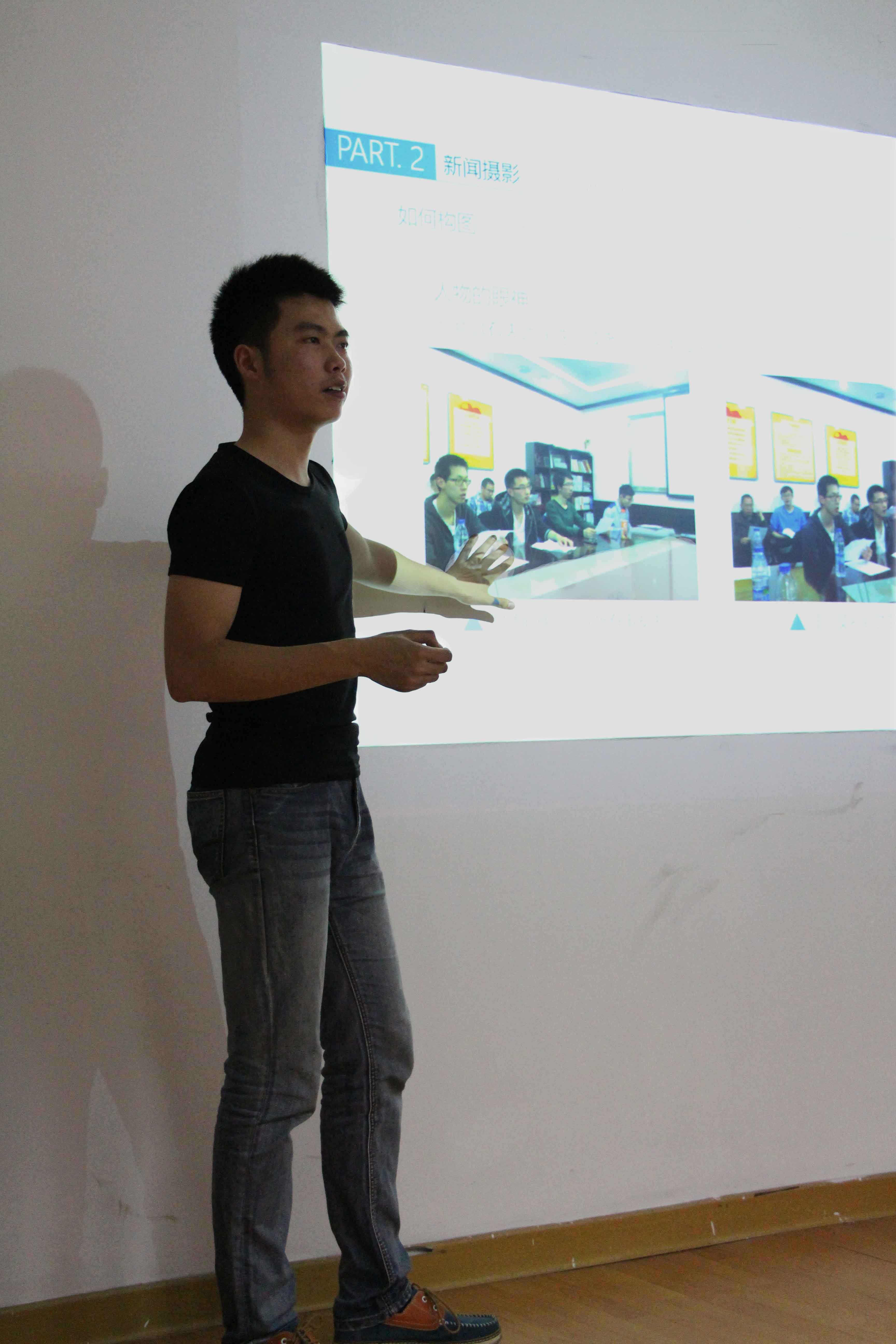 接着,李林芝同学介绍了针对新闻摄影的一些方法技巧,包括如何针对不同的新闻内容进行构图、取景和用光。他引用了电气学院网上几幅由其他人拍摄的新闻照片为例,介绍了新闻摄影中应该避免的取景不到位,主次不分等问题,并展示了他自己拍摄的新闻图片,使大家能够直观的学习到正确的新闻摄影方法,学会用照片真实、准确又生动地反映新闻事件。