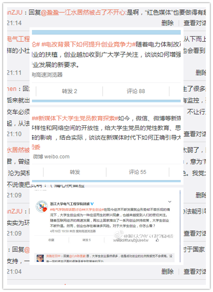 第二期微话题讨论活动自43日正式开展以来,本科生各党支部通过电气学院官方微博平台定期发布话题并设置话题引导员展开讨论,已经针对“网购盛行、电商当道,针对日益普及的电子商务你怎么看?”、“雾霾来袭,看了《穹顶之下》你有什么思考?”、“楼市新政”、“大学生创业”、“电改背景下如何提高企业竞争力?”等社会热点问题展开广泛讨论,并且受到了学院师生的广泛关注和热议,通过线上讨论大家对热点问题有了新的思考,同时,通过资搜集、阅读相关资料以及同学们相互间的辩论,认知层面上升了一个新的高度。随着活动的深入进行,优秀的讨论将在学院微信平台进行推送,充分利用新媒体渠道和平台,加强对党团员的教育。