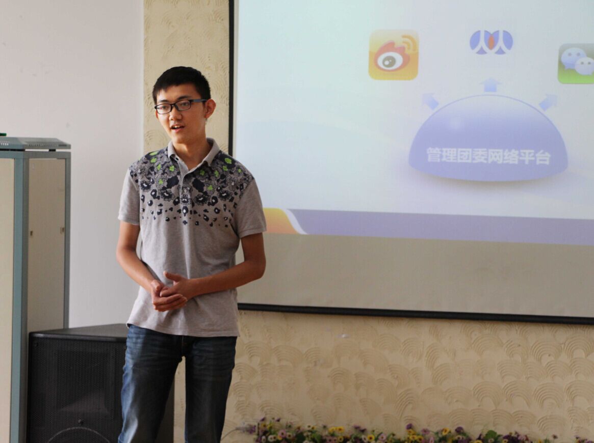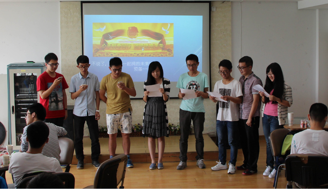 随后各部门的代表依次上台进行展示,介绍自己部门的成员及主要职责,并带来了精心准备的表演。组织部的同学们带来了一曲《最炫小苹果》,边唱边跳的表演彰显了他们的活力,笑料不断。接着实践部和素拓部的小伙伴们为大家演唱了《光荣啊,中国共青团》,慷慨激昂,令人振奋。最后青志部和新闻部的成员带来诗朗诵《我的成长我的梦》,诙谐搞笑的语言背后暗藏追逐梦想的决心,赢得阵阵掌声。