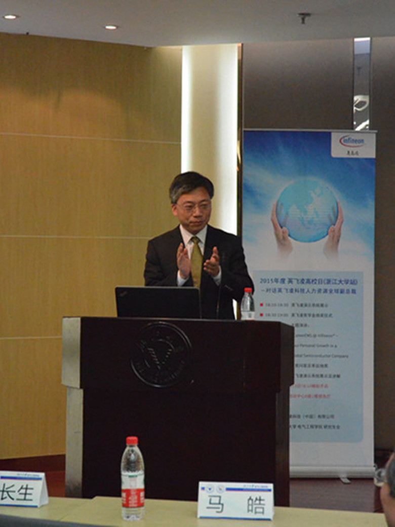 晚上18:30,活动如期在永谦活动中心B座1楼报告厅拉开了帷幕。出席活动的有英飞凌人力资源副总裁全球大学计划总负责人Mr. Ralf Memmel先生、英飞凌中国区政府关系总监及中国大学部负责人刘健先生,mg4355线路检查官网副院长马皓老师,mg4355线路检查官网电力电子技术研究所所长徐德鸿老师,mg4355线路检查官网电力电子学科副教授胡长生老师等。首先英飞凌中国区政府关系总监及中国大学部负责人刘健先生对英飞凌公司以及Joint Lab进行了介绍。
