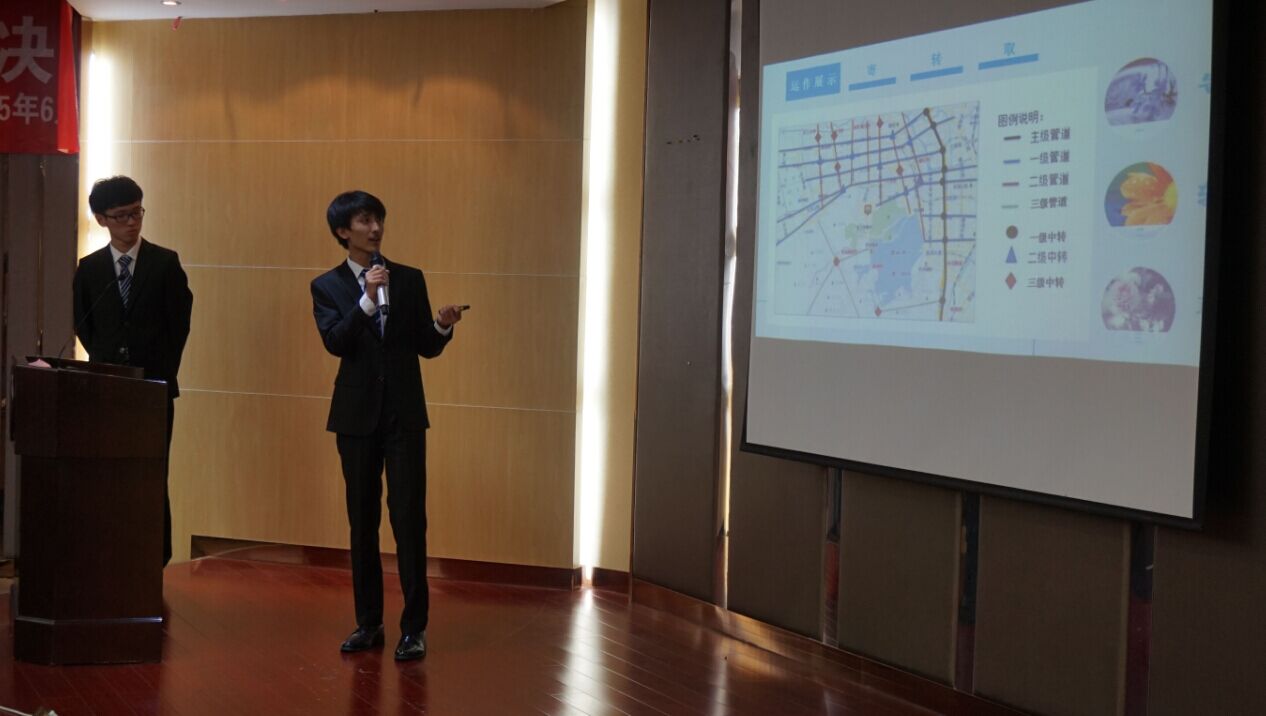 八支决赛队伍按照事先确定好的抽签顺序依次进行展示。每组的展示由六分钟的团队作品展示以及六分钟的评委提问环节组成。每组都发挥稳定,进行了精彩的展示,并与评委老师们进行了深入的讨论。他们的作品,从现实出发,畅想未来,广泛涉及未来生活的衣食住行等多方面。有“极客三人行”队超轻便捷还能实时监测身体健康的“CoolCoat”,有“厨具联萌”队全自动中式菜肴烹饪器,有“创意工业人”自动分类垃圾的rubbot,有“四个水枪手”队穿梭在城市地下管道的胶囊车,有“Brain 威武”队能自动识别并诊疗疲倦的耳麦,有“MoXing”队能有效控制车内温度的柔性太阳能车辆光冷系统,有“WLOX”队私人订制的智能控释平台,还有“ILT战队”给我们带来不仅仅让医生看见更让医生看清的小型无影灯盘。在比赛过程中,参赛队员们层出不穷的创意和想法,让在场的各位评委老师赞不绝口,而评委老师细致认真的点评,也让各位参赛的同学受益匪浅。