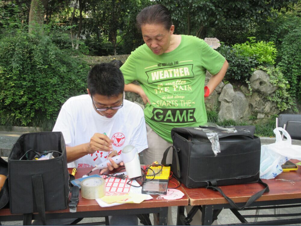 一大早队员们就已经聚集在了校门口,带着清点好了的维修工具配件和课程展品。10路车,满载着他们的期待与雄心,带他们驶向约定的地点。刚一下车,队员们就被小营社区的美景所吸引了,绿意葱葱,清风送爽。他们刚走进社区公园,就看到早已等在那里的社区负责人和好几位拿着待维修电器的闻讯而来的社区居民。队员们连忙手脚麻利地搬好桌子椅子,便开始耐心地听物主们对电器故障的描述,然后上演维修进行曲——物主信息登记,拧螺丝,拆开外壳,万用电表检查电路板,查找问题所在……