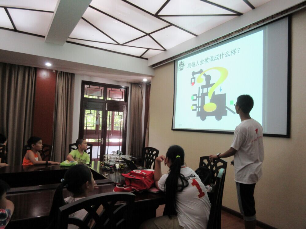 下午两点,小孩子们如期到来,在会议室里坐得整整齐齐,期盼着他们的课程。队长准备了“机器人机械结构”的主题,更是从浙大紫金港校区带去了自己制作的重达十几斤的机器人。“大家知道机器人是什么东西吗?是不是机器做的人啊?”序幕从此处拉开。