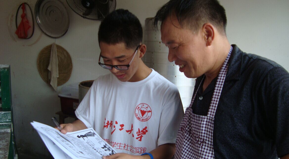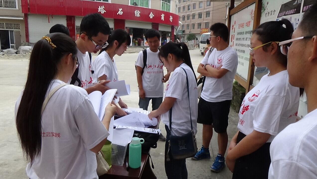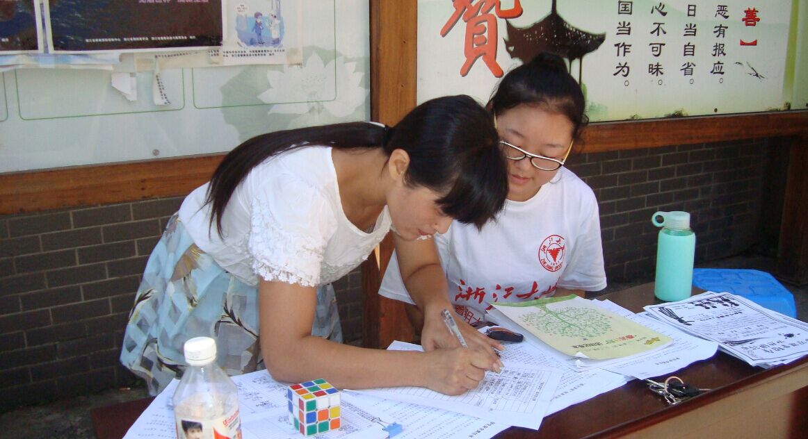 根据前一天的会议安排,实践队员们定下具体的分工、宣传方案、宣传路线、报名时间和地点、注意事项等等。实践队分成四小组,一组留守礼堂布置场地,其他三组沿着塔石街道主要延伸的三个方向走家串户招生。山环水绕的塔石在清晨和傍晚的时候很清凉,但过了九点,随着太阳越来越高,夏天炎热的气息便逐渐弥漫开来,到了十点,更是烈日当头。尽管汗流浃背,实践队员们却不曾停下脚步,他们只希望能够招收到更多的孩子,让浙大精神传递地更广,更远。