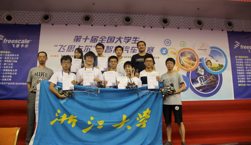 2015年8月26日至29日,第十届全国大学生“飞思卡尔”杯智能汽车竞赛全国总决赛在济南山东大学举行,参加本次赛事的122个高校198支队伍是经8个分赛区的选拔后,在全国430所高校1893支参赛队(摄像头组684支、电磁组613支、光电组596支)的角逐中突颖而出,获得了参加全国总决赛的资格。我校2支参赛队在7月20日至22日嘉兴学院举行的浙江省赛区比赛中,获得了全国总决赛的入场券。在总决赛期间,参赛队员们克服了高温天气、长途旅程、训练场地紧张等带来的各种困难,在3天的时间里进行了一场饱含速度与激情的青春对决,经过激烈拼搏,最后发挥出色,浙大一队获得全国总决赛电磁组一等奖。
