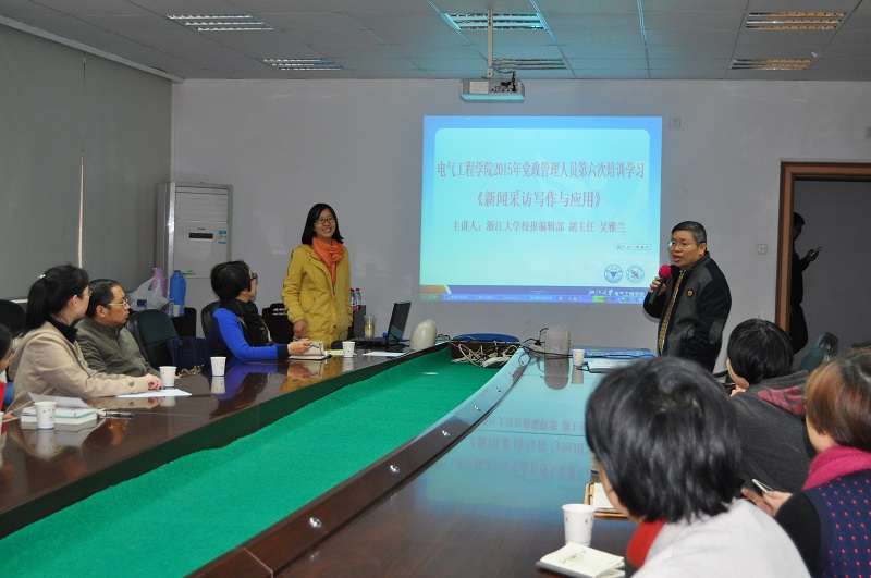 11月13日下午,电气学院于玉泉校区电机工程楼201举办了党政管理人员第六次培训学习,主题是“新闻采访写作与应用”。邀请了mg4355线路检查官网校报编辑部副主任吴雅兰老师主讲,电气学院机关工作人员及各党支部宣传员参加了培训。