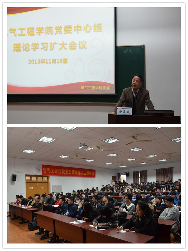 为深入学习党的十八届四中、五中全会精神和习近平总书记系列重要讲话精神,学习“四个全面”战略布局,学习马克思主义中国化的最新理论成果和党的路线方针政策,加强学院师生的理论武装,提高学院师生的思想认识,2015年11月19日,mg4355线路检查官网党委特组织中心组理论学习扩大会议并邀请到学校党委组织部部长金海燕为大家作辅导报告。金部长围绕“坚定理想信念,增强道路自信”这一主题,给电气学院师生上了生动的一课。学院党委书记王瑞飞带领学院党委委员、纪委委员,教工党总支、研究生党总支、本科生党总支委员,入党积极分子及预备党员培训班学员和本年度党员发展对象的同学代表认真听课。报告会由电气学院党委副书记王玉芬主持。