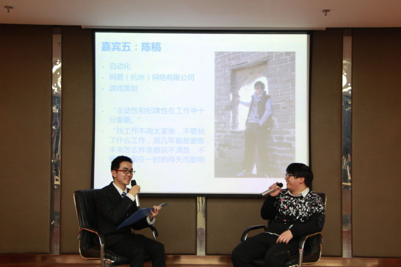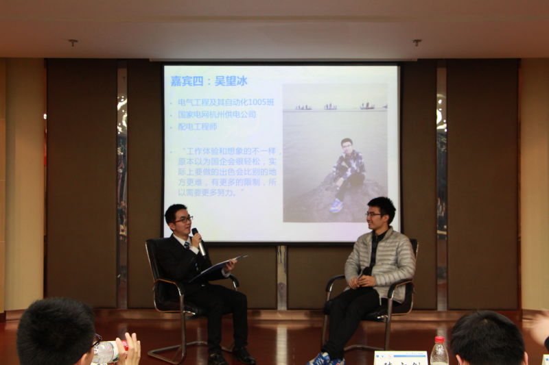 在采访环节,围绕工作内容、工作环境和薪酬等倍受关注的话题,学长学姐们做了详细的介绍,揭开了职场神秘的面纱。“华为的科研氛围非常浓厚,这就逼迫自己必须不断去学习”,“国网的工作弹性比较大,要求与其他部门相互配合,总的来说比较安逸”,“网易的工作需要你以高频率不断更新大脑,你需要与美术和程序等各个部门沟通协调,非常有挑战性”。几位学长的介绍让我们认识到了私企和国企工作性质的差异。安逸与枯燥并同,挑战又伴有风险,孰优孰劣?重要的是认清自己,明确方向,勿忘初心。
