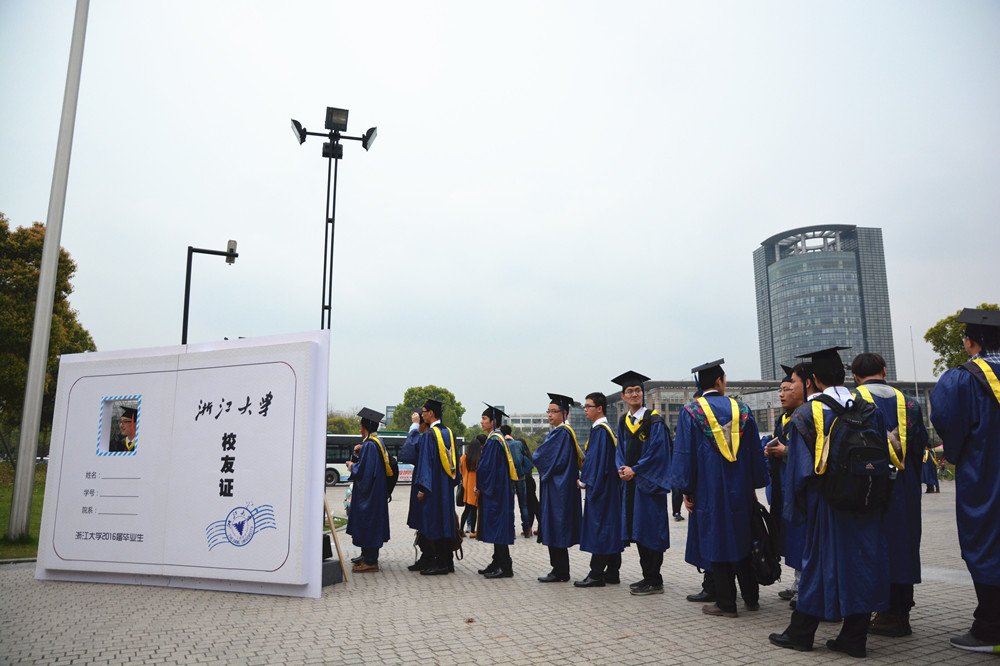 随着毕业典礼的时间逐渐临近,毕业生们纷纷来到体育馆前。矗立在正当中的照片墙成为了焦点,一张张照片,记载着求是园的点点滴滴。前来与它合影的人络绎不绝。而竖立在旗杆旁的校友证也吸引了大家的眼球,等待合影的毕业生在它后方自发排起了长队。