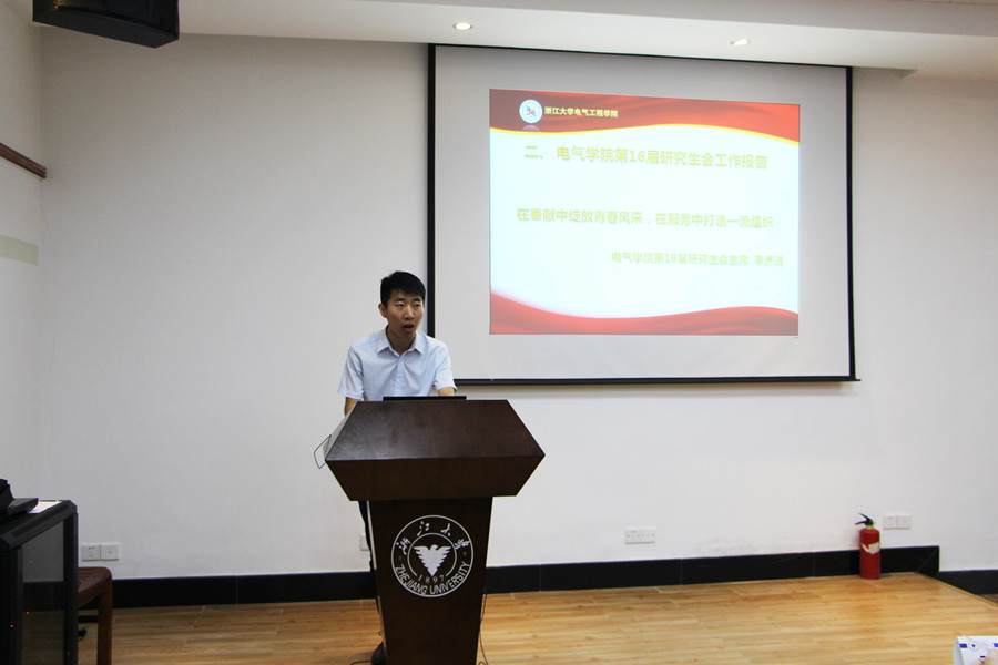 在宣布会议开始并介绍来宾之后,第十六届研究生会主席李济沅做了题为《在奉献中绽放青春风采,在服务中打造一流组织》的第十六届研究生会工作报告。他从人才培养、学术互动、文体活动、对外交流四个方面对研会过去一整年的工作进行了总结。他也对第十七届研究生会从加强研会内部建设、深入研究生实验室生活、推进研会微信平台建设、开拓学生权益服务平台四个方面提出了自己的期望与建议。